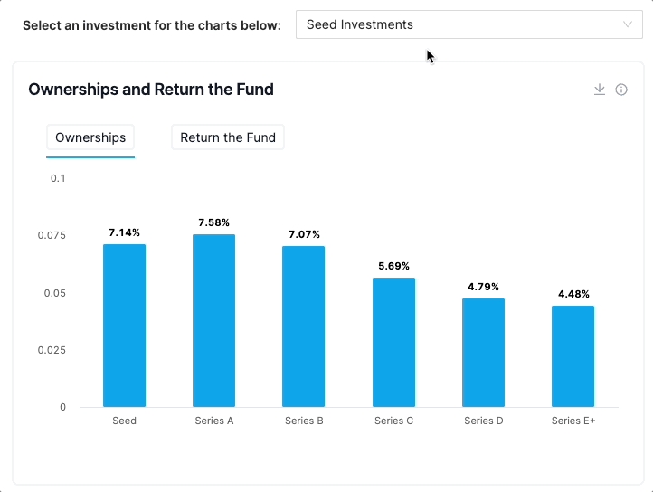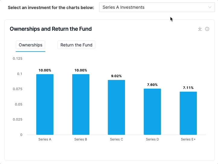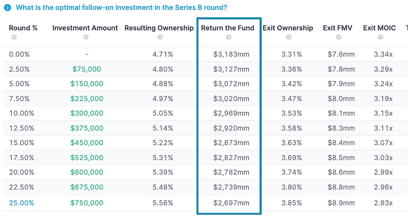 When setting reserves for a future round, Tactyc automatically shows how Return the Fund changes at different reserve levels. As reserves increase, Return the Fund decreases and thus a manager can use this as a guide to optimize their reserve for a particular deal.
