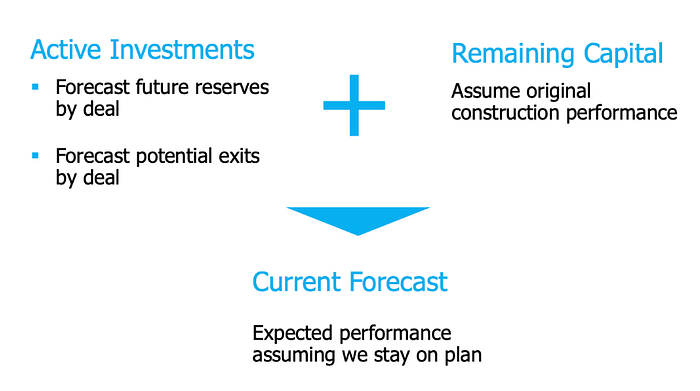 Combining the deal-level forecasts and the construction plan gives the GP a current forecast. This is the new expected performance of the fund that takes into account its actual deals.