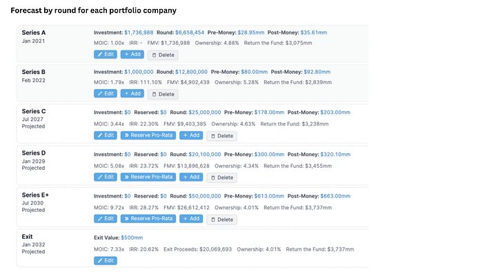 For deal-level forecasting, Tactyc offers the ability to bulk import your existing investments and then forecast by round for each portfolio company, including automatically reserving your pro-rata or defining a specific investment size.