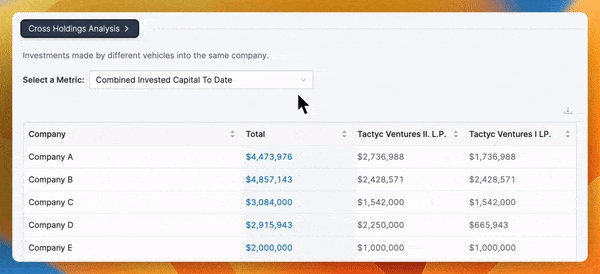If you manage multiple vehicles that may invest in the same company (e.g., a “main fund” + “opportunity fund”), Tactyc automatically identifies these investments to show combined ownerships, FMV, etc.