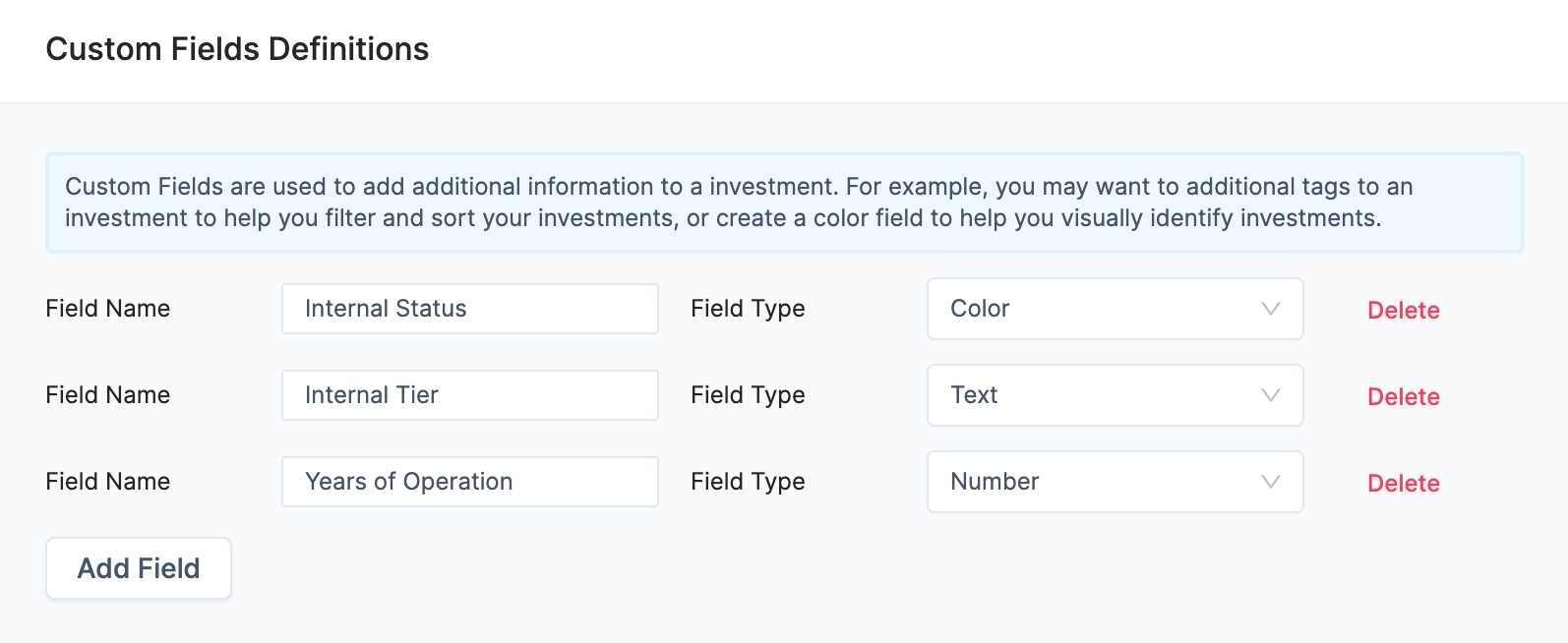 Starting today, you can create Custom Fields to track and report on additional data on portfolio companies. These could be color codes ("traffic lights"), texts, tags, numbers or dates and these fields work alongside Tactyc's existing fields such as Deal Tags, Sector, Geography etc. Learn more here. Step 1: Define Custom Fields and Type. Define up to 10 custom fields for each portfolio.