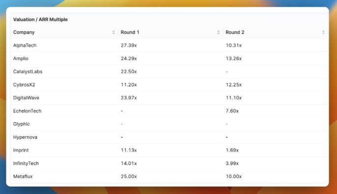 The summarized results will show the following: 1. Average Valuation Multiple (Portfolio-Level) Mean or median valuation multiple over subsequent rounds across the entire portfolio.