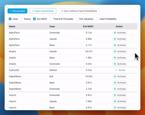 We've made it easier to run fund performance scenarios by enabling you to "activate" certain performance case for your investments in Tactyc's Scenario Builder.